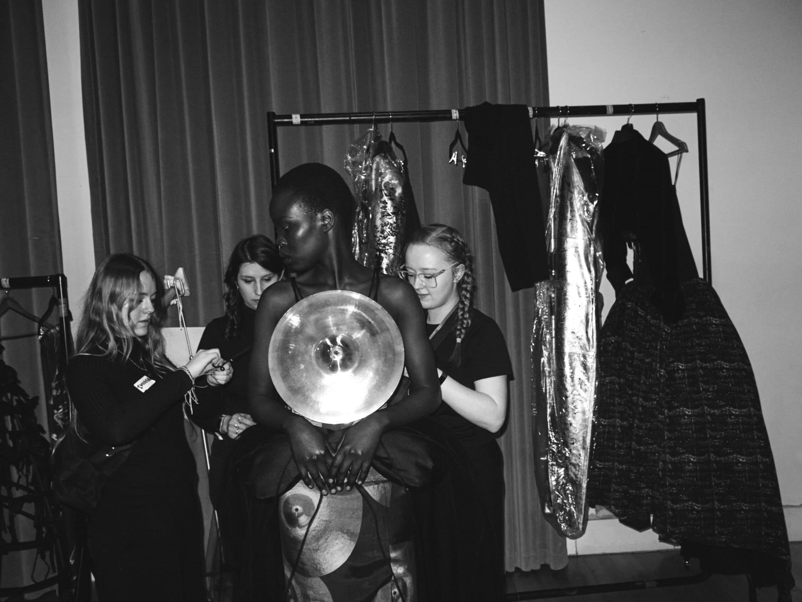PM: The tuba piece that was turned into a metal corset is quite special because I played brass instruments as a child. It was kind of amazing to be able to take a broken tuba and create fashion with it — it’s really a joy for me to see the brand evolving. My other favourite pieces are the all-white looks that were made from a really lovely Tencel linen fabric which has a really nice bounce. Both have cummerbunds and are really classic and simple — very statuesque. And of course there’s the pannier skirt which we stitched hundreds of vintage bow ties from Guildhall’s costume store onto. But all the pieces are so special because they’re all individual and linked to the narrative.