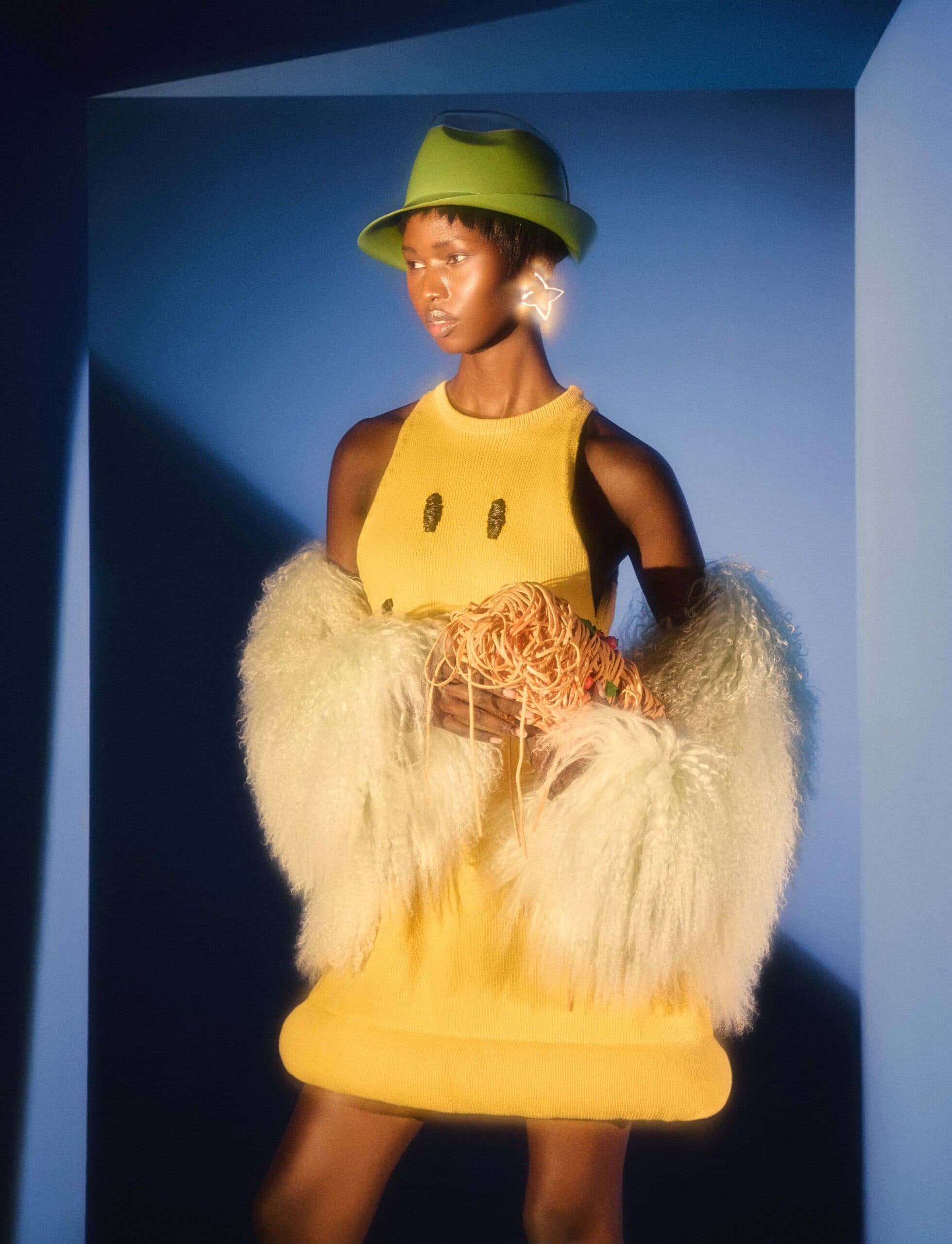 Myarach wears dress and bag by MOSCHINO, jacket by YVES SALOMON, hat by STEPHEN JONES MILLINERY and earrings by LOUIS VUITTON.
