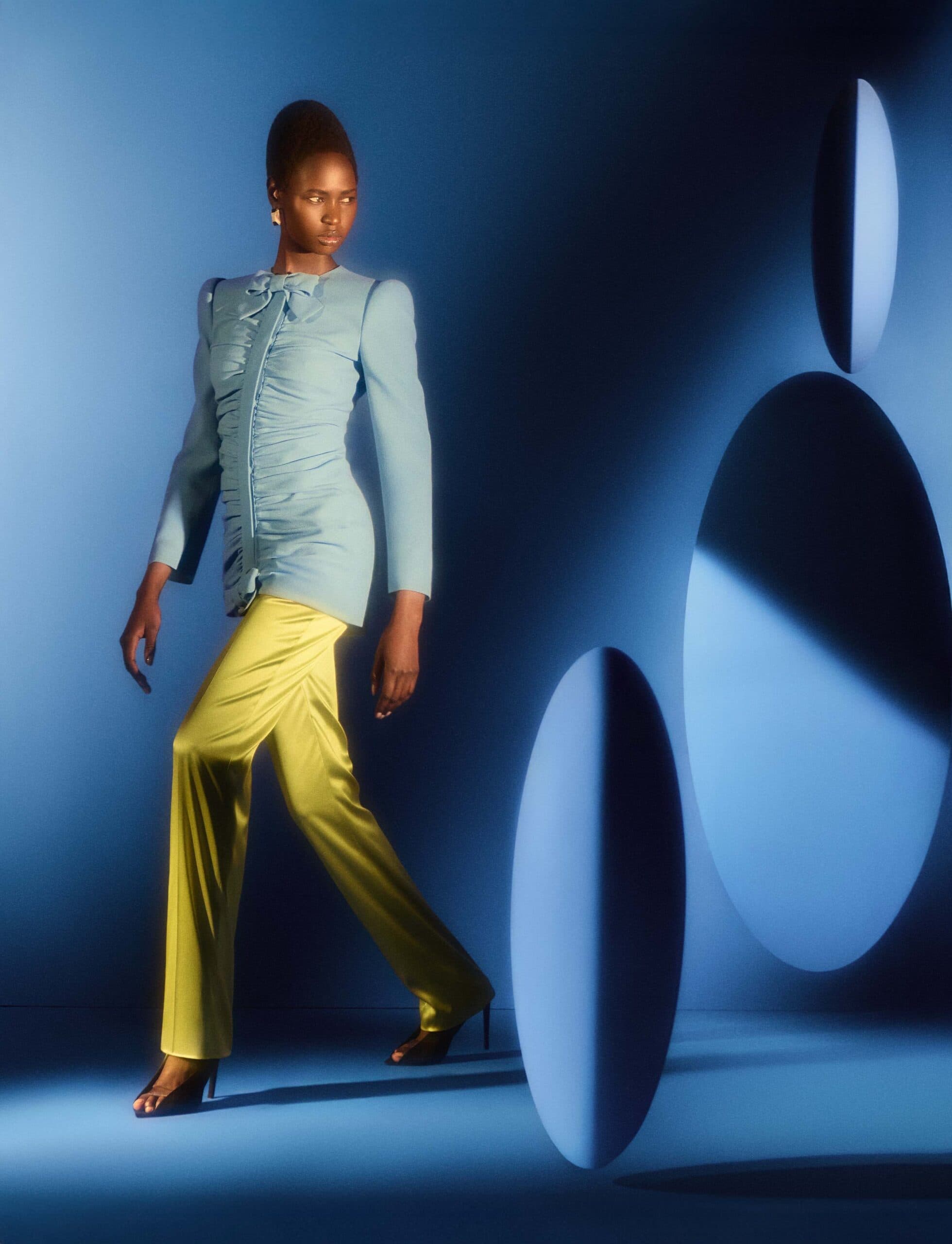 Nyarach wears top, trousers and shoes by VALENTINO and earrings by MELANIE GEORGACOPOULOS.