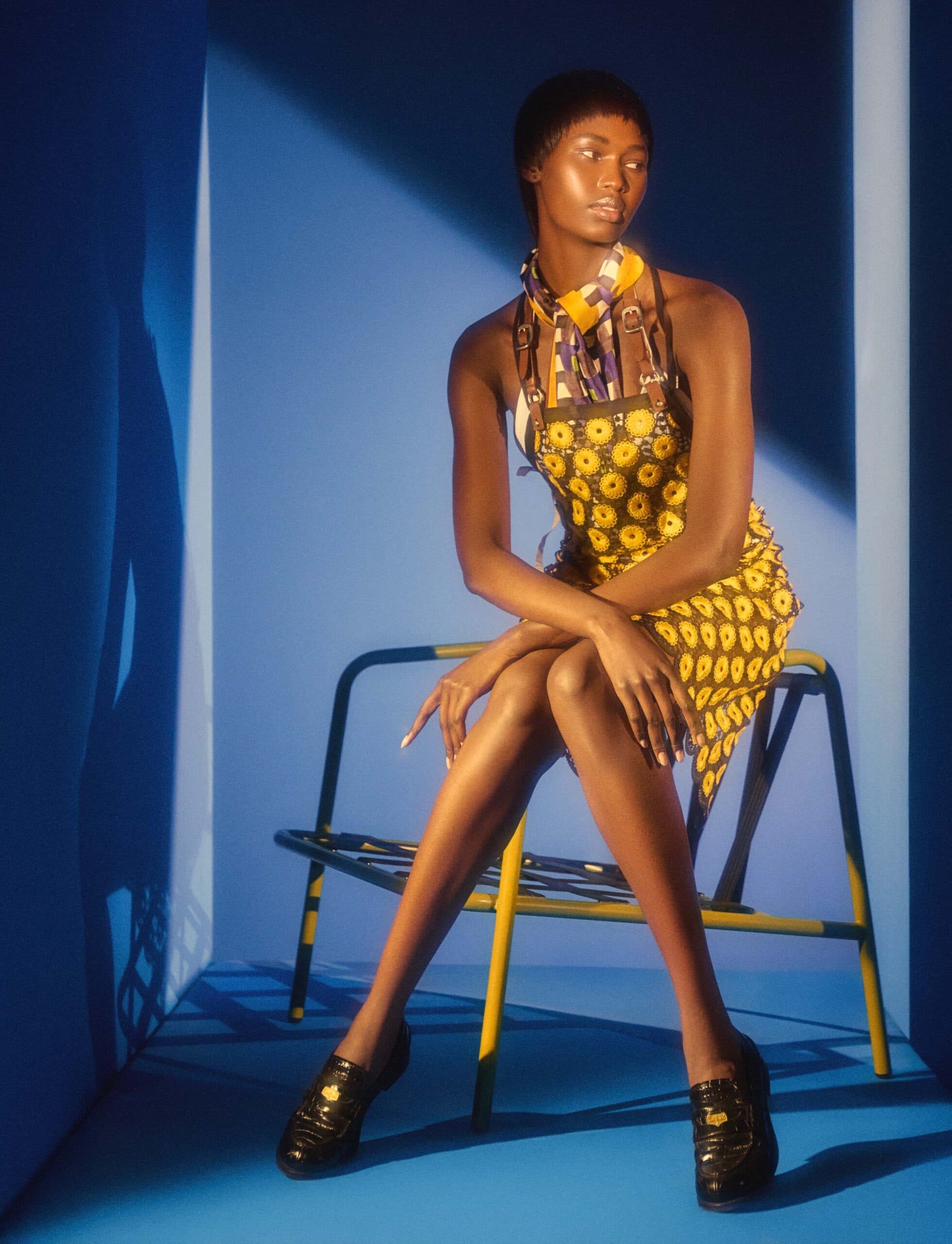 Nyarach wears bralette, apron dress, shoes and scarf by MIU MIU.