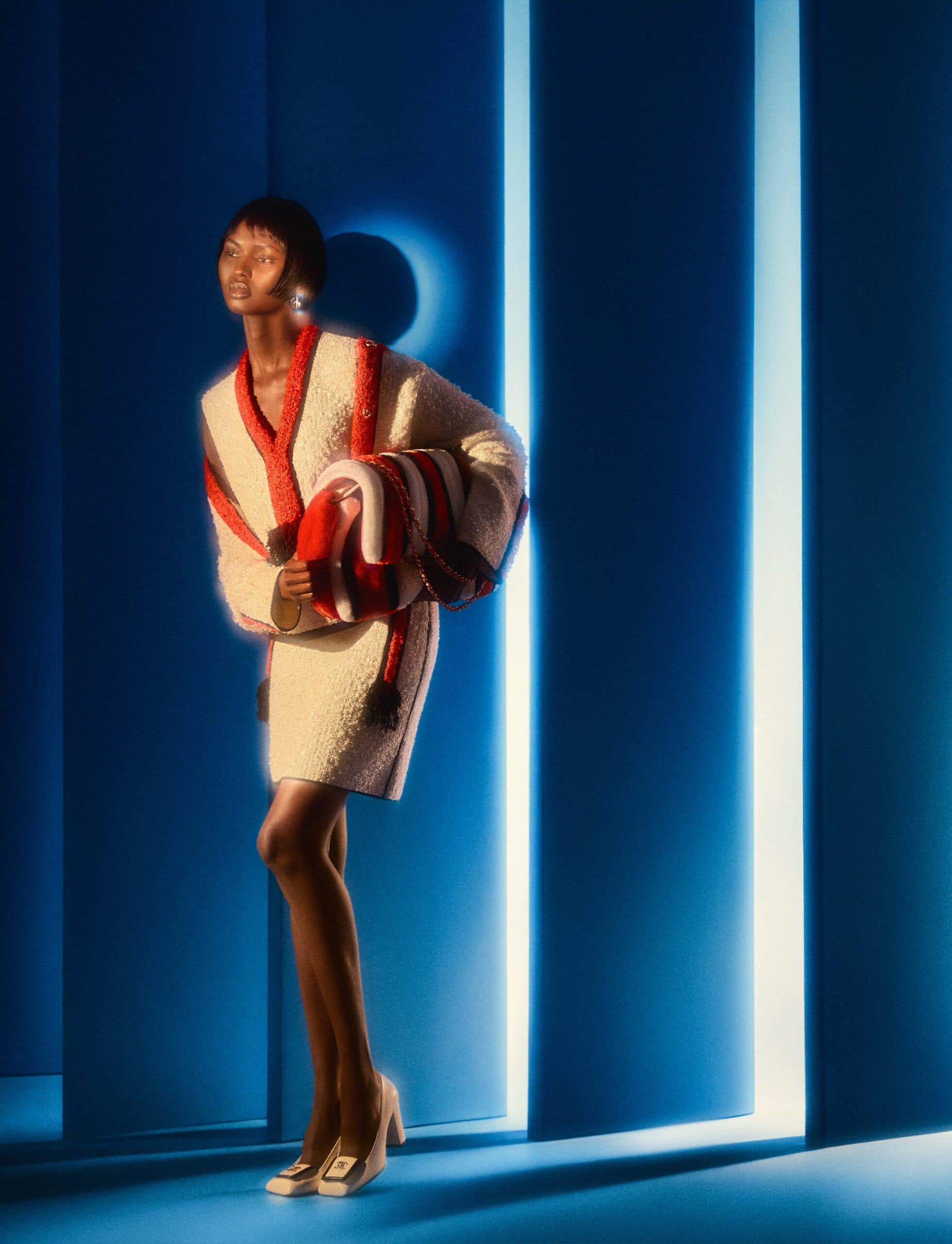 Nyarach wears jacket, vest, skirt, shoes, bag and earrings by CHANEL.