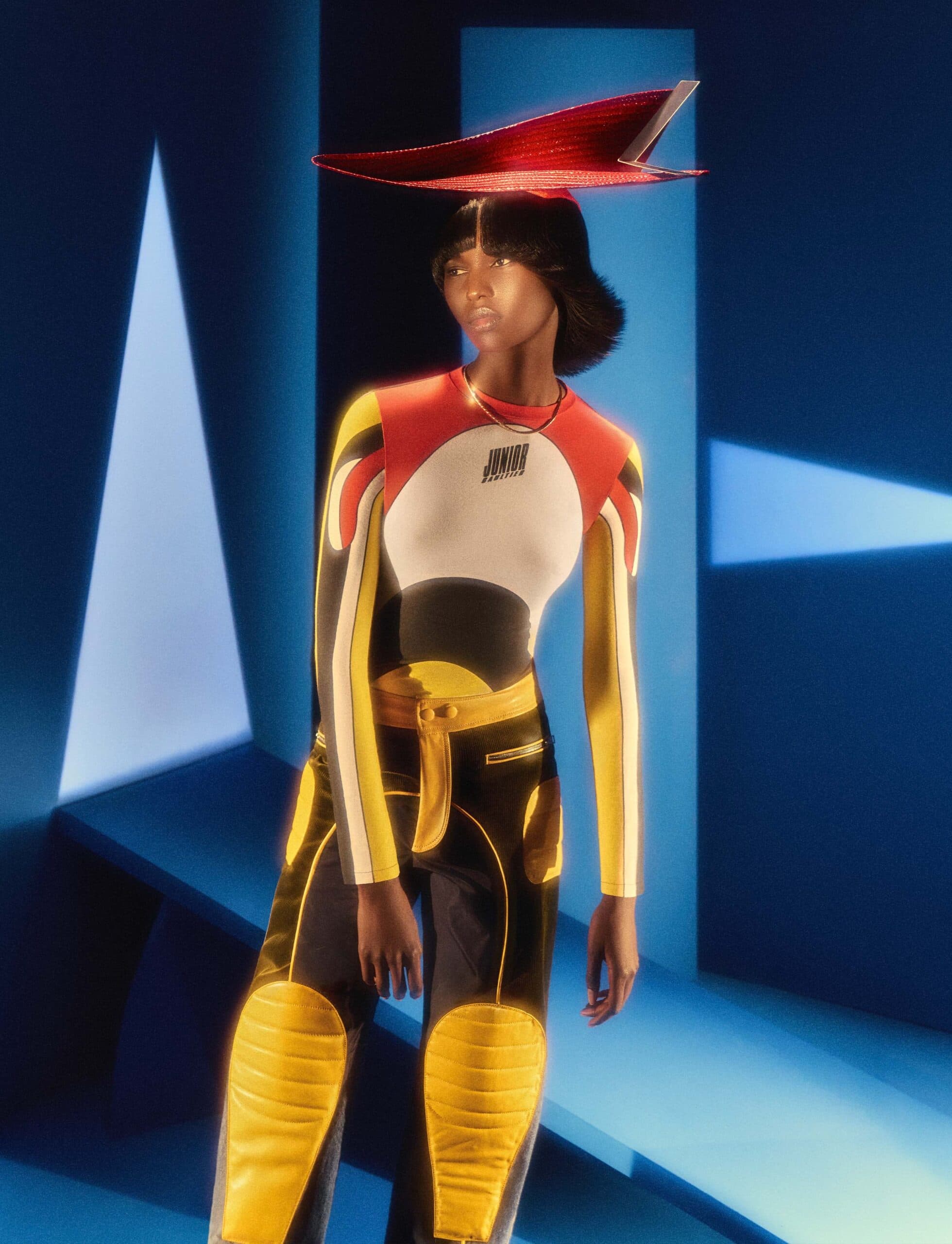 Myarach wears top and trousers by JEAN PAUL GAULTIER, hat by STEPHEN JONES MILLINERY and necklace by LOUIS VUITTON.