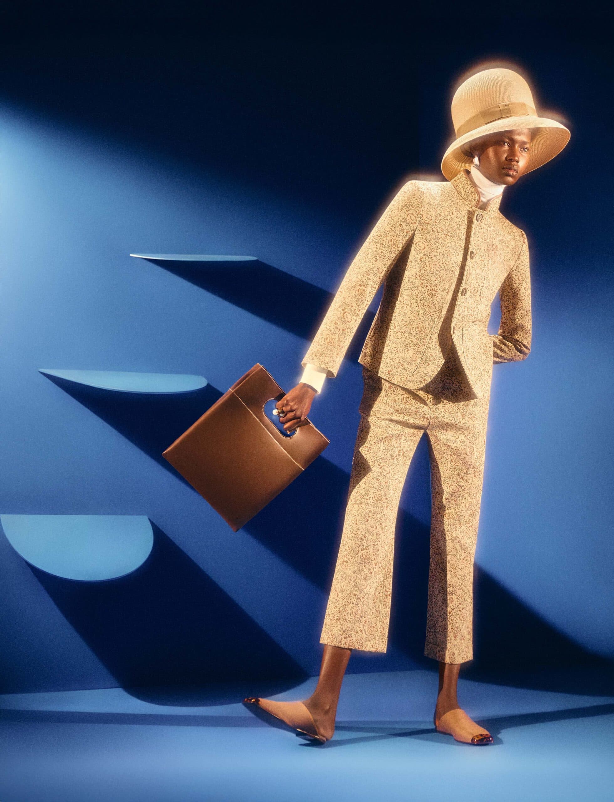 Nyarach wears jacket, top, trousers, shoes, hat and bag by LORO PIANA and rings and earrings by MELANIE GEORGACOPOULOS.