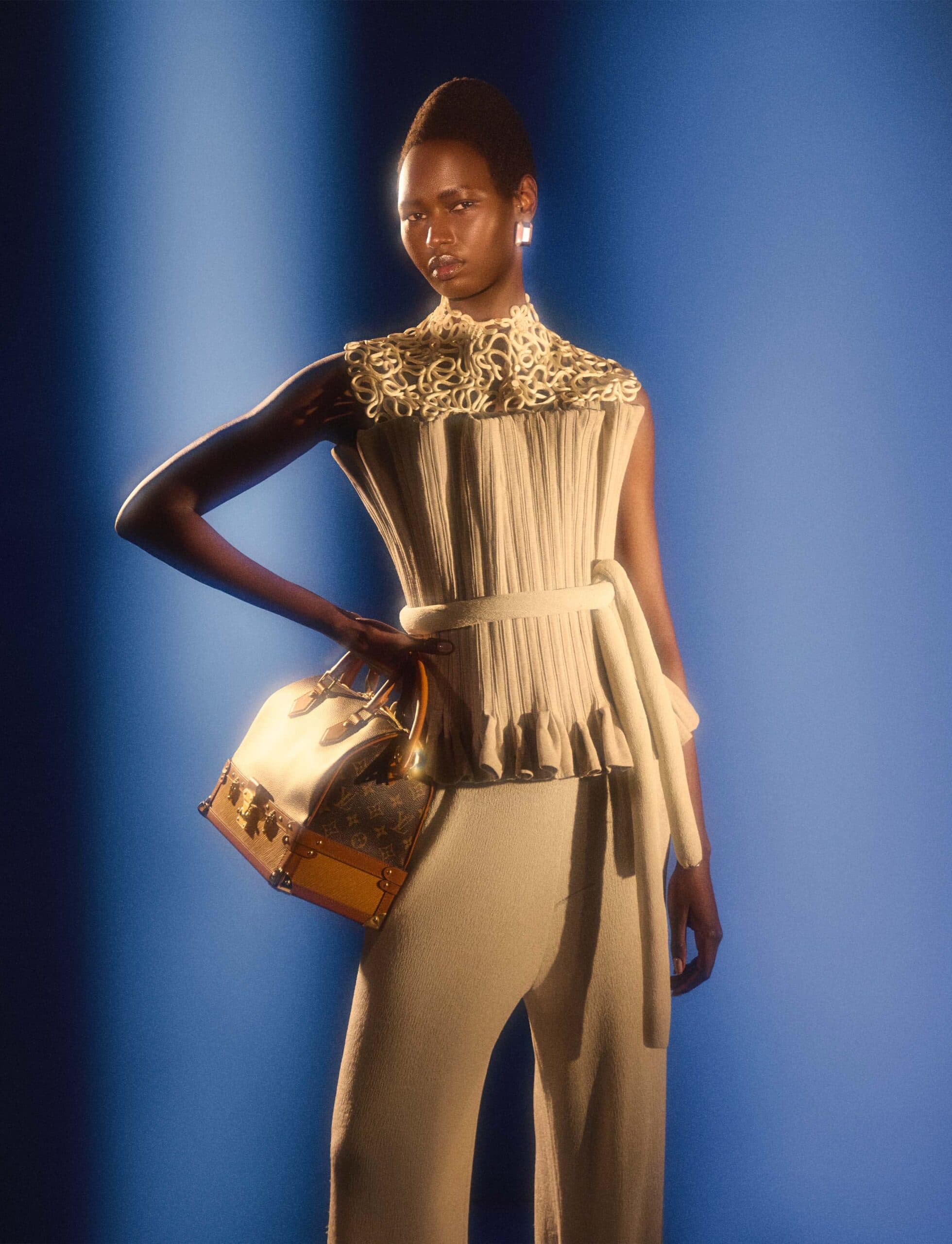 Nyarach wears top, trousers, corset belt and bag by LOUIS VUITTON and earrings by MELANIE GEORGACOPOULOS.