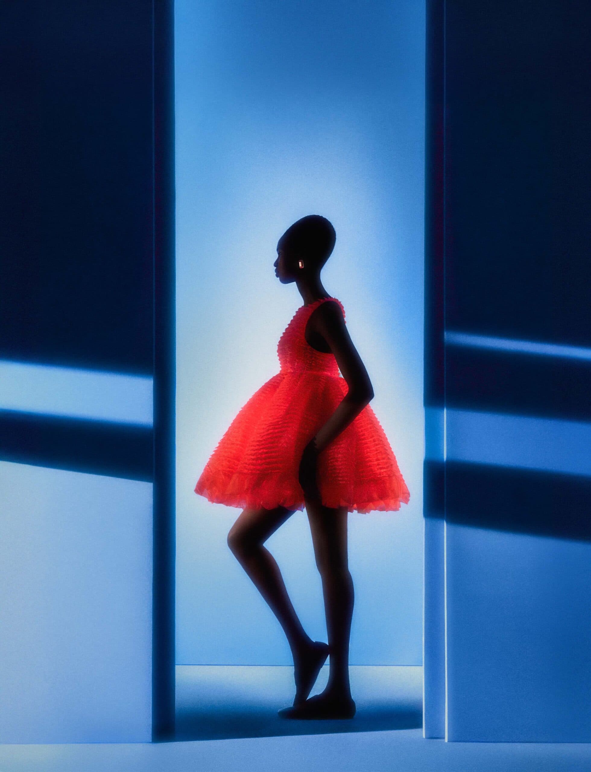 Nyarach wears dress and shoes by GIVENCHY by Sarah Burton and earrings by MELANIE GEORGACOPOULOS.