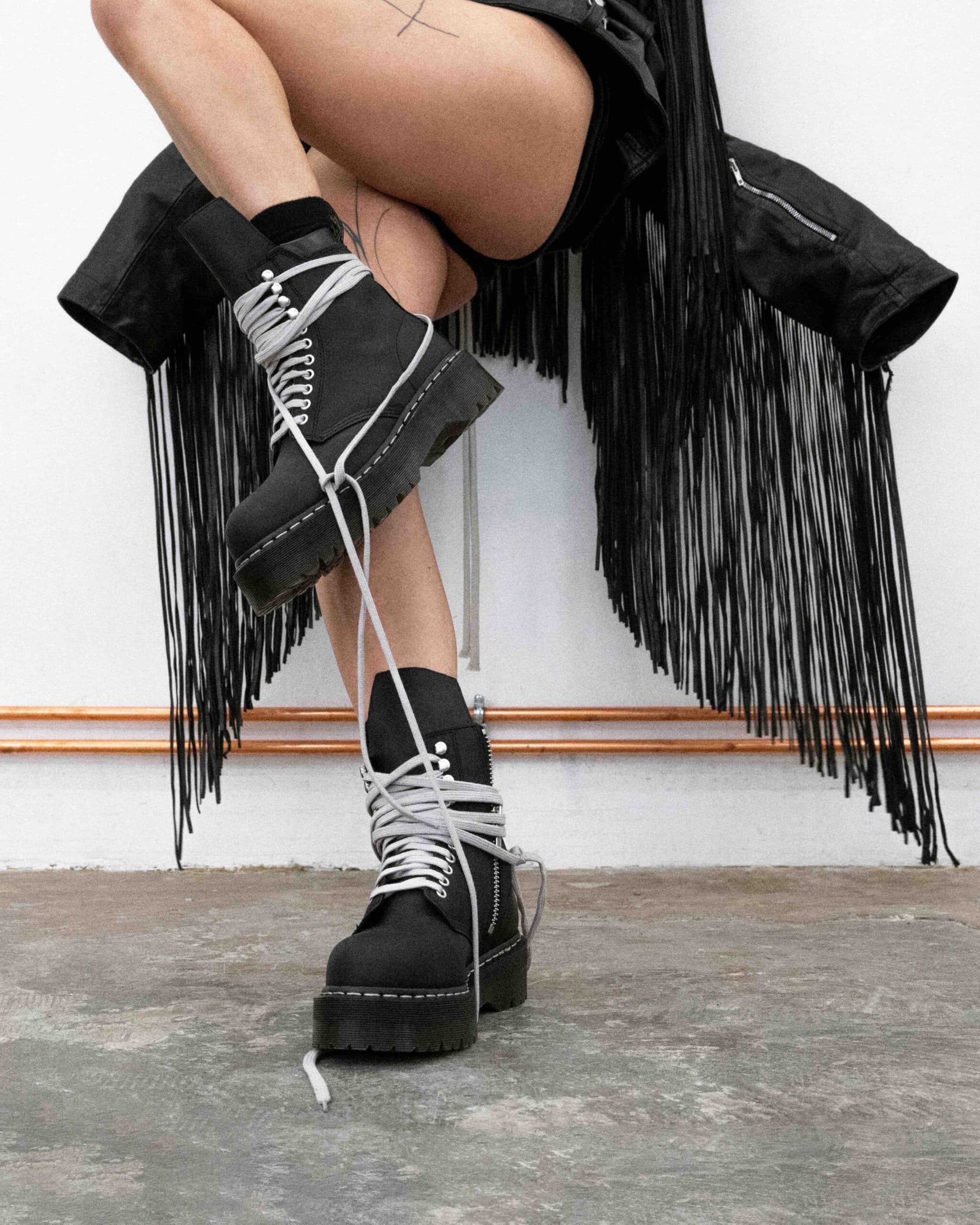 Ending on a seasonally gothic vibe: King of the grunge aesthetic Rick Owens has once again partnered with Dr. Martens to create some serious stompers. They’ve taken some of the brand’s iconic silhouettes — specifically the 1460, the 1B60 and a Steel Toe work boot — and transformed them into towering monoliths set on the brand’s Quad (read: super thick) sole. But the chunkiness isn’t actually the star of the show; it’s Rick’s signature lace detailing. The Megalace and Pentalace see extra-long laces wrapping around the boots in a pentagram style that feels slightly occult-like (Owens was inspired by the “pagan hallucination” of Joseph Beuys’ 1965 performance art). The campaign leans into the same brooding energy. It’s all Turkish DJ Sissy Misfit, sharp angles and silhouettes. DMs x Rick Owens is literally the perfect Halloween drop and I’m obsessed. Nab a pair here.