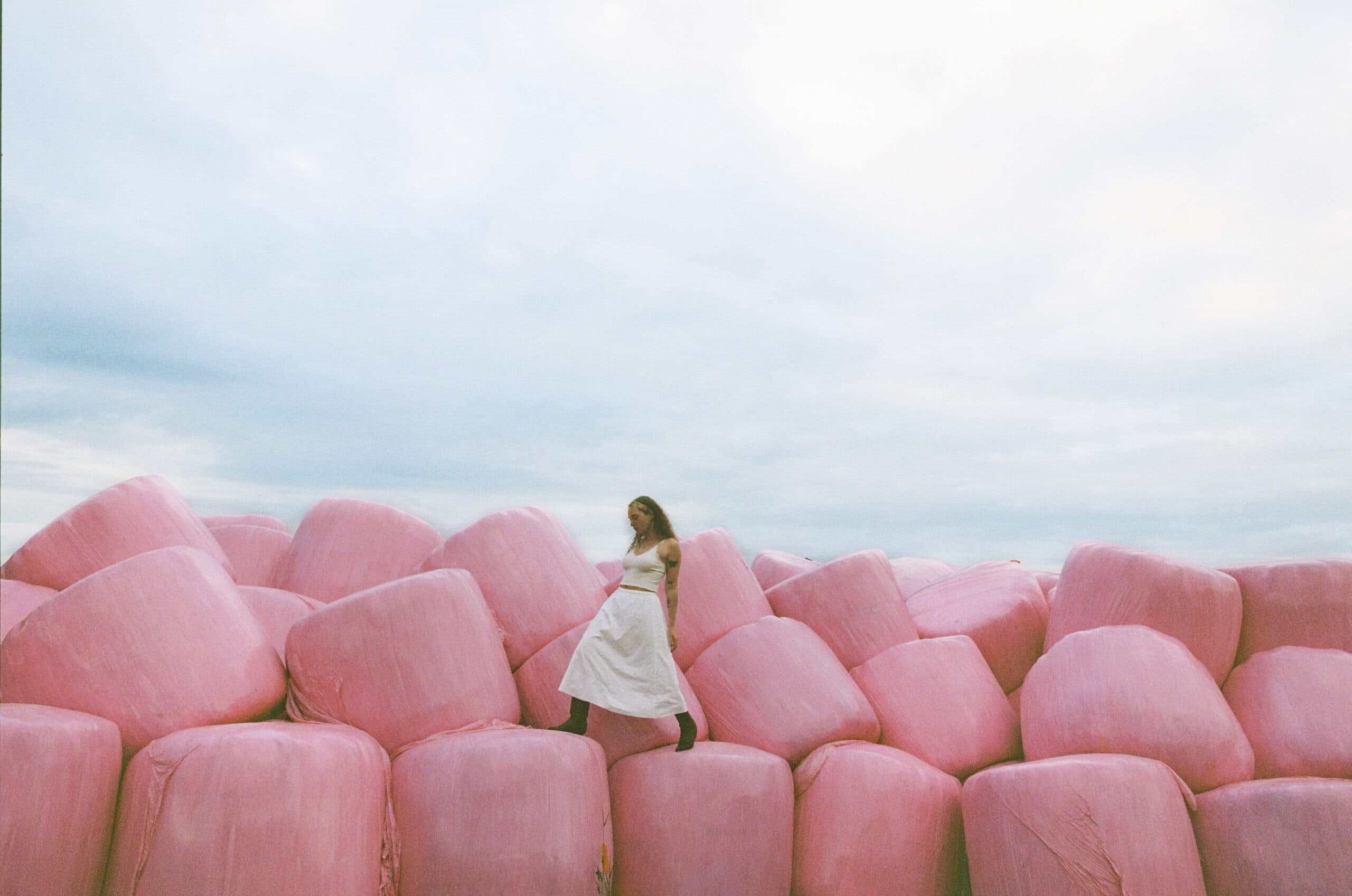 I really wanted it to be as real and human as possible because the music is kind of sad. For example, “Trigger” is one of the most heartfelt songs that I have ever written, and it really hurts every time I sing it on stage because it’s super real. Normally my aesthetics are a bit darker, but for this EP, I was staying in France with some friends, and we just went outside and took photos and had fun. I found some hay bales that were so pink, and I was really impressed with how that looked. I also feel like the songs are so sad, they could do with a bit of colour and happiness. This whole EP is about that contrast: happy and sad, struggling but also being fine.