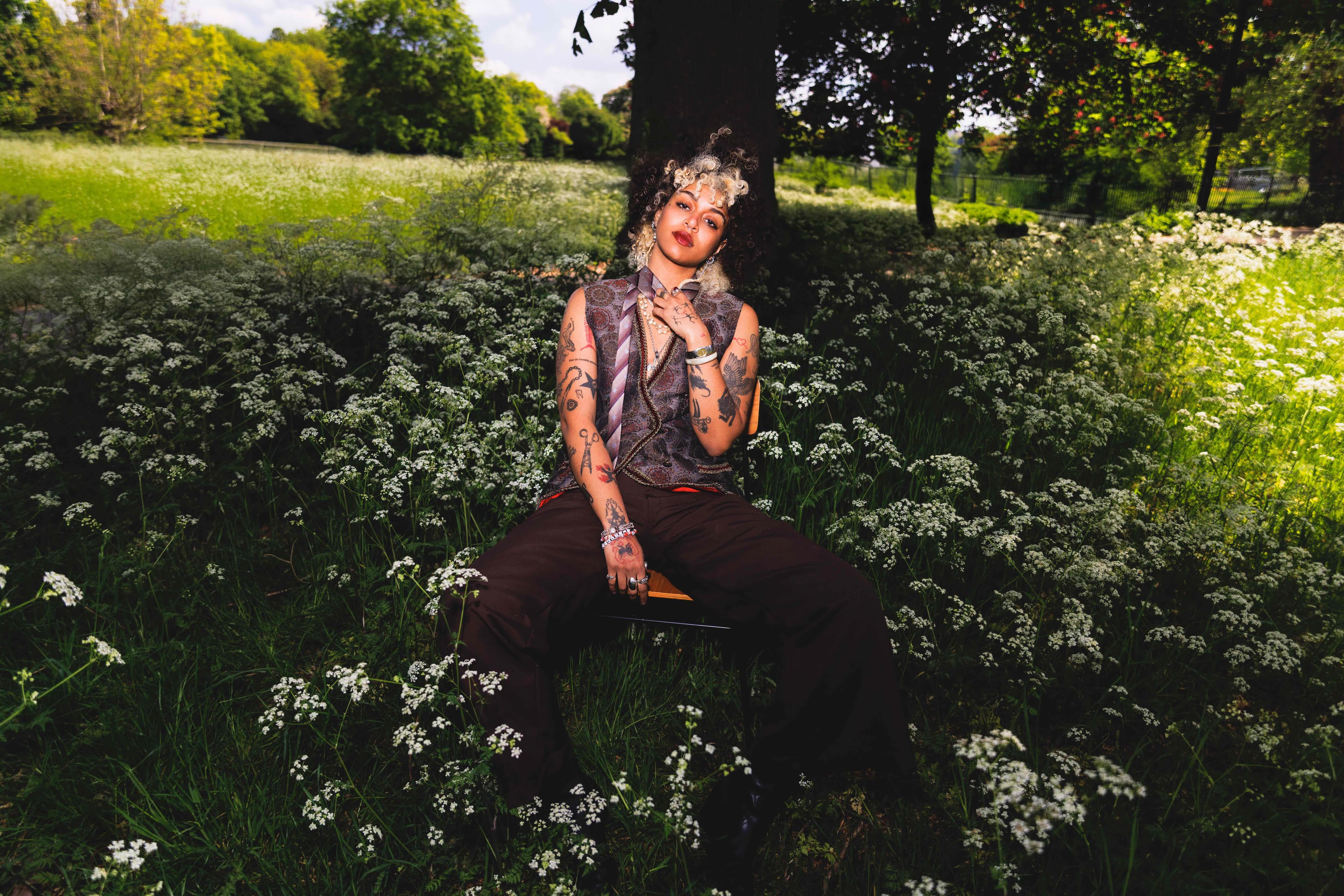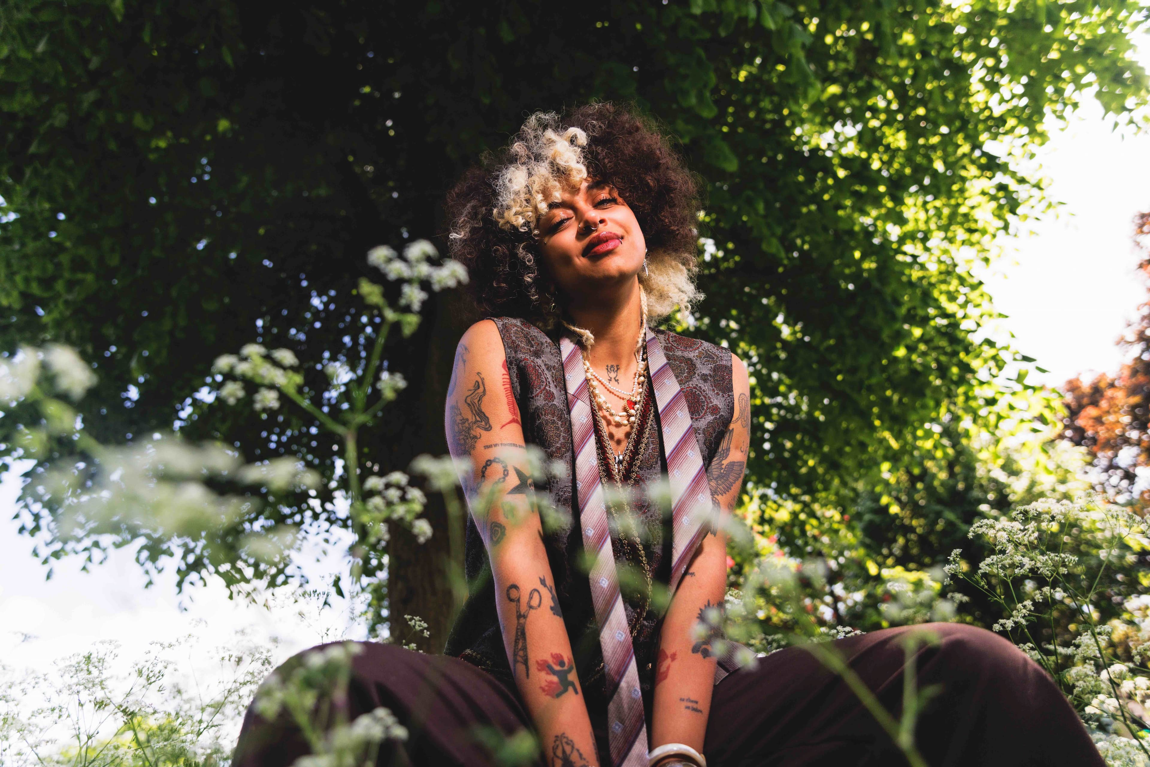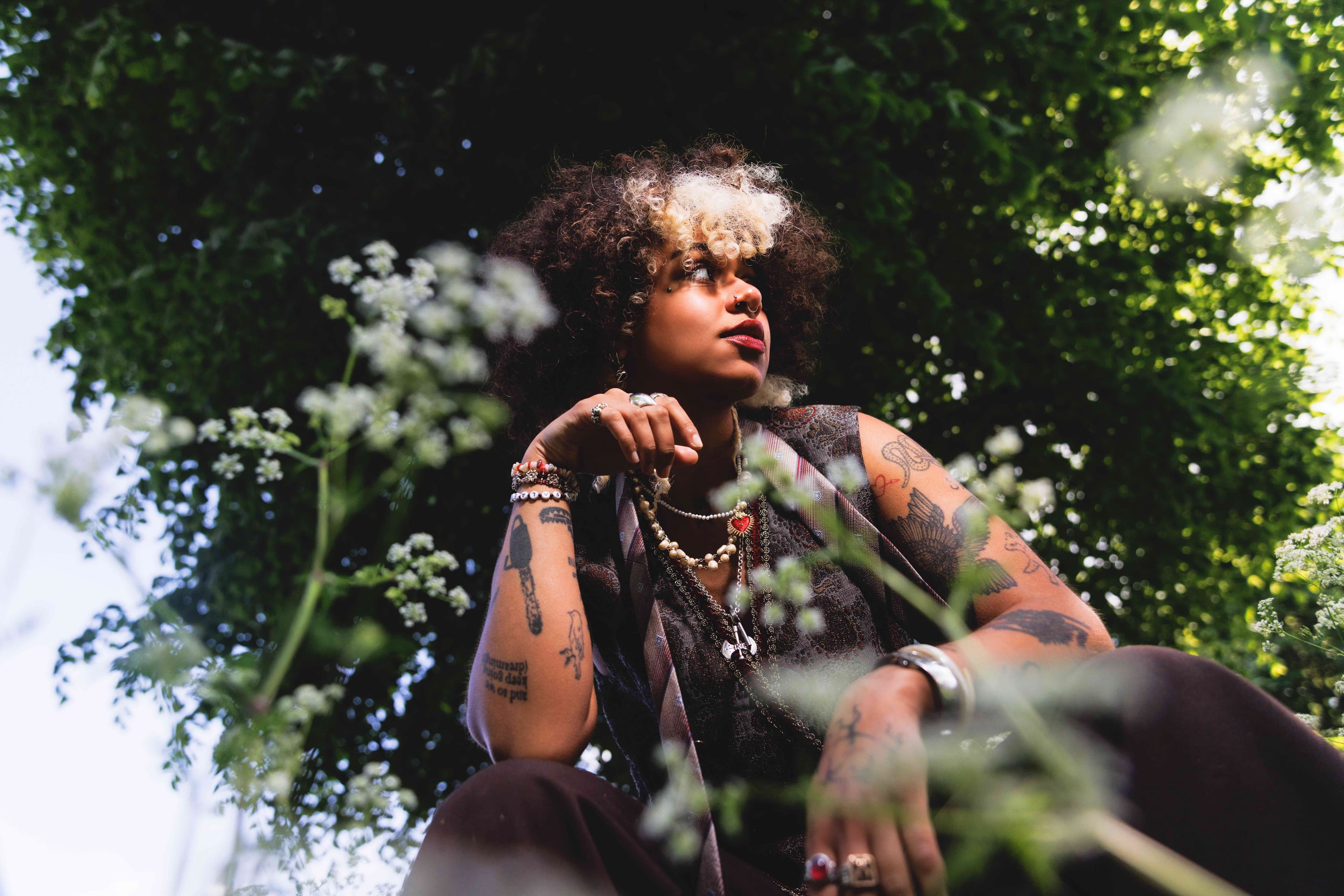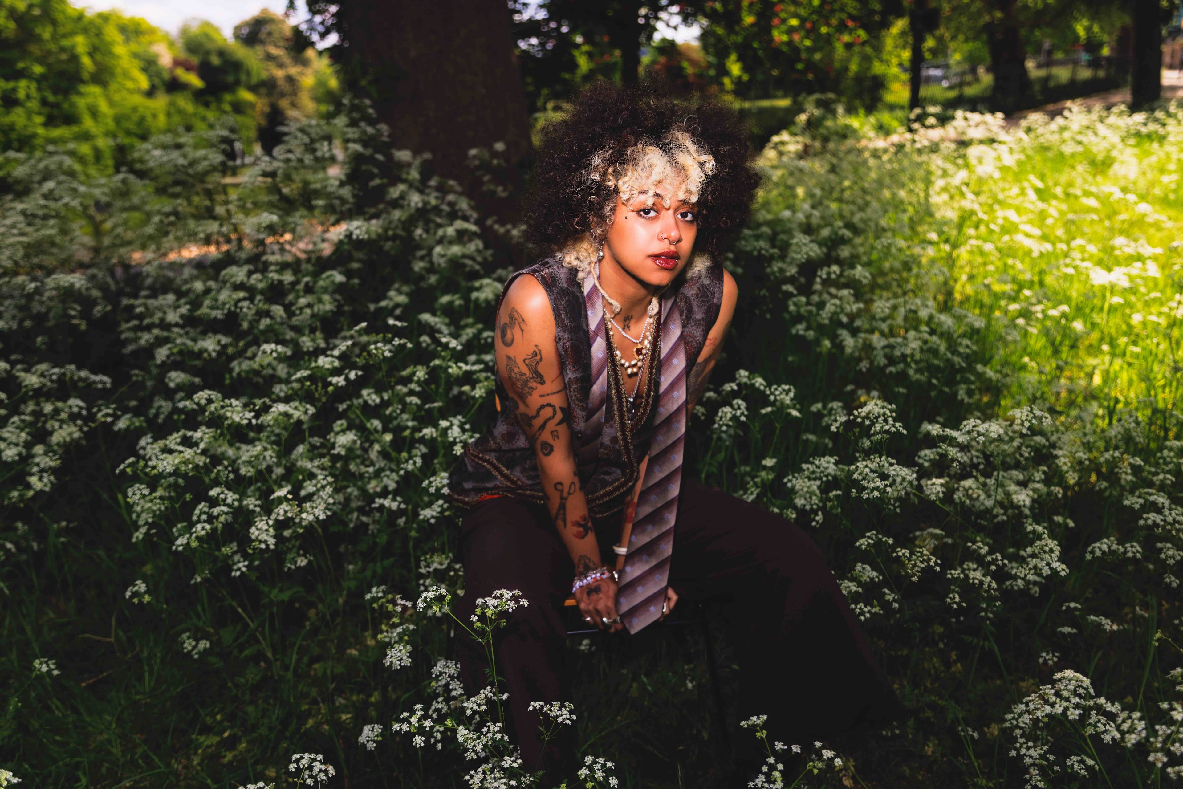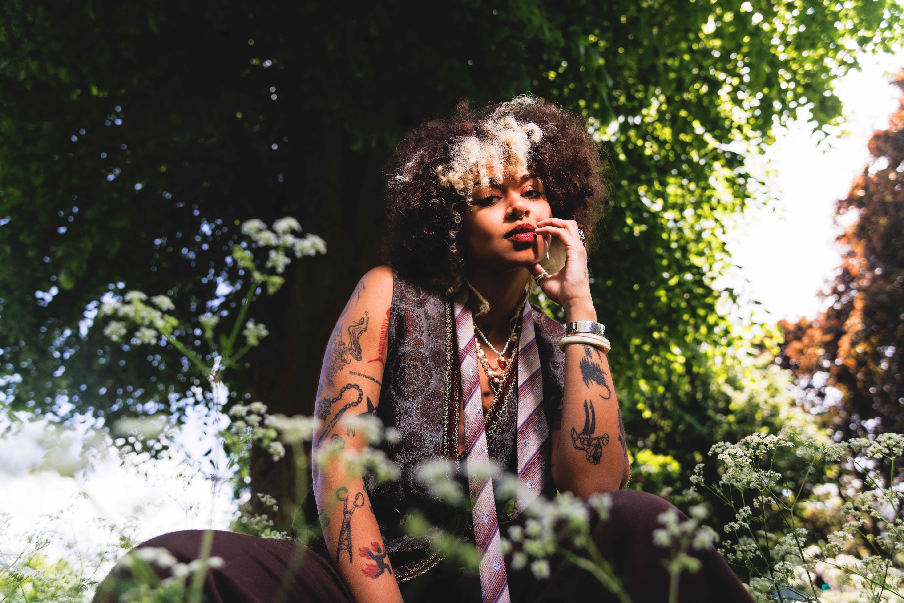 Nxdia has never fit neatly into a box. The Egyptian-born, Manchester-bred musician once yearned to fit in — now, the twenty-five-year-old couldn’t give a damn. With their signature blonde-spattered afro, piercings and tattoos, Nxdia isn’t your conventional Arab, and has no desire to be anything other than themselves. Being one of few queer, neurodivergent and non-binary diaspora artists, Nxdia’s fluidity radiates an authenticity that’s hard not to love. They refuse to bow down to arbitrary definitions of genre, never stopping in the same sound long enough to be pinned down, with the only constant being Nxdia’s voice seamlessly weaving between Arabic and English.