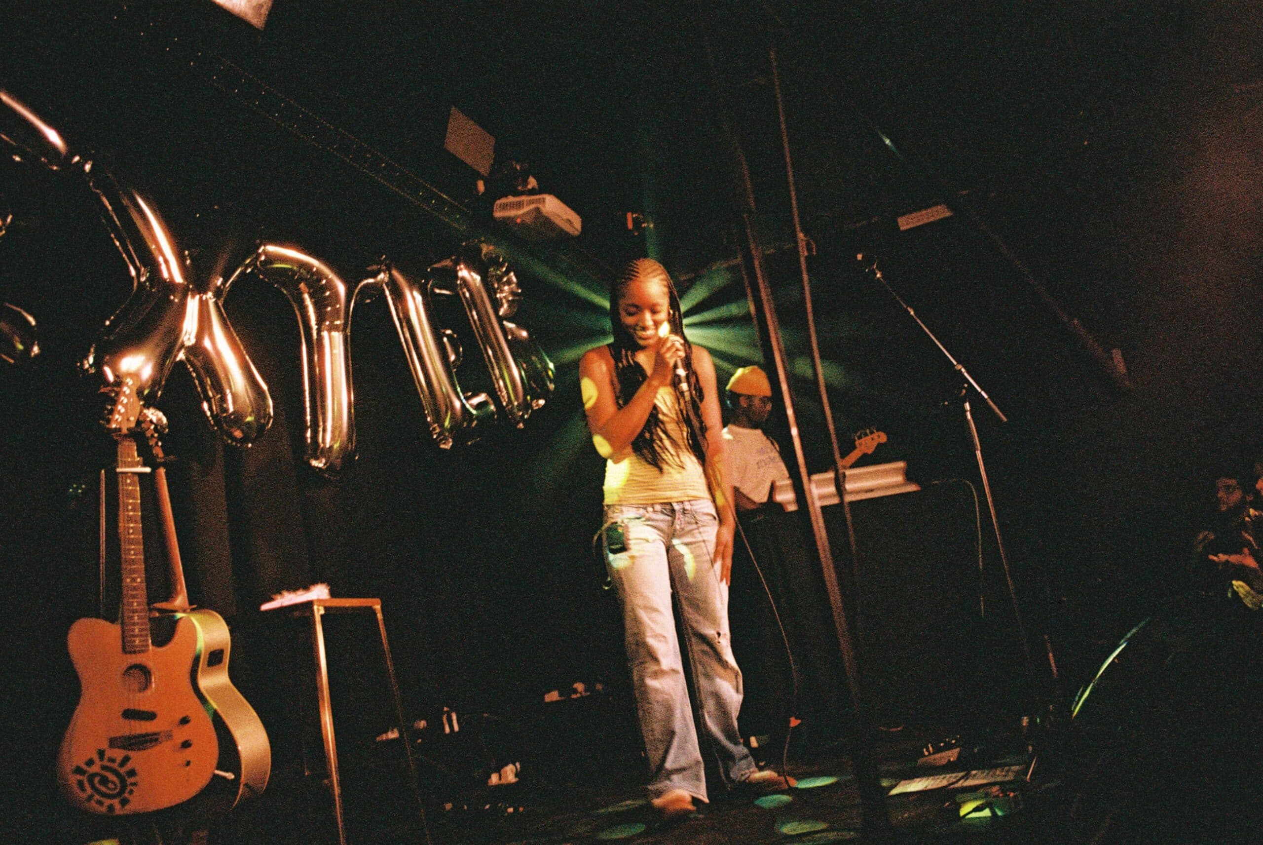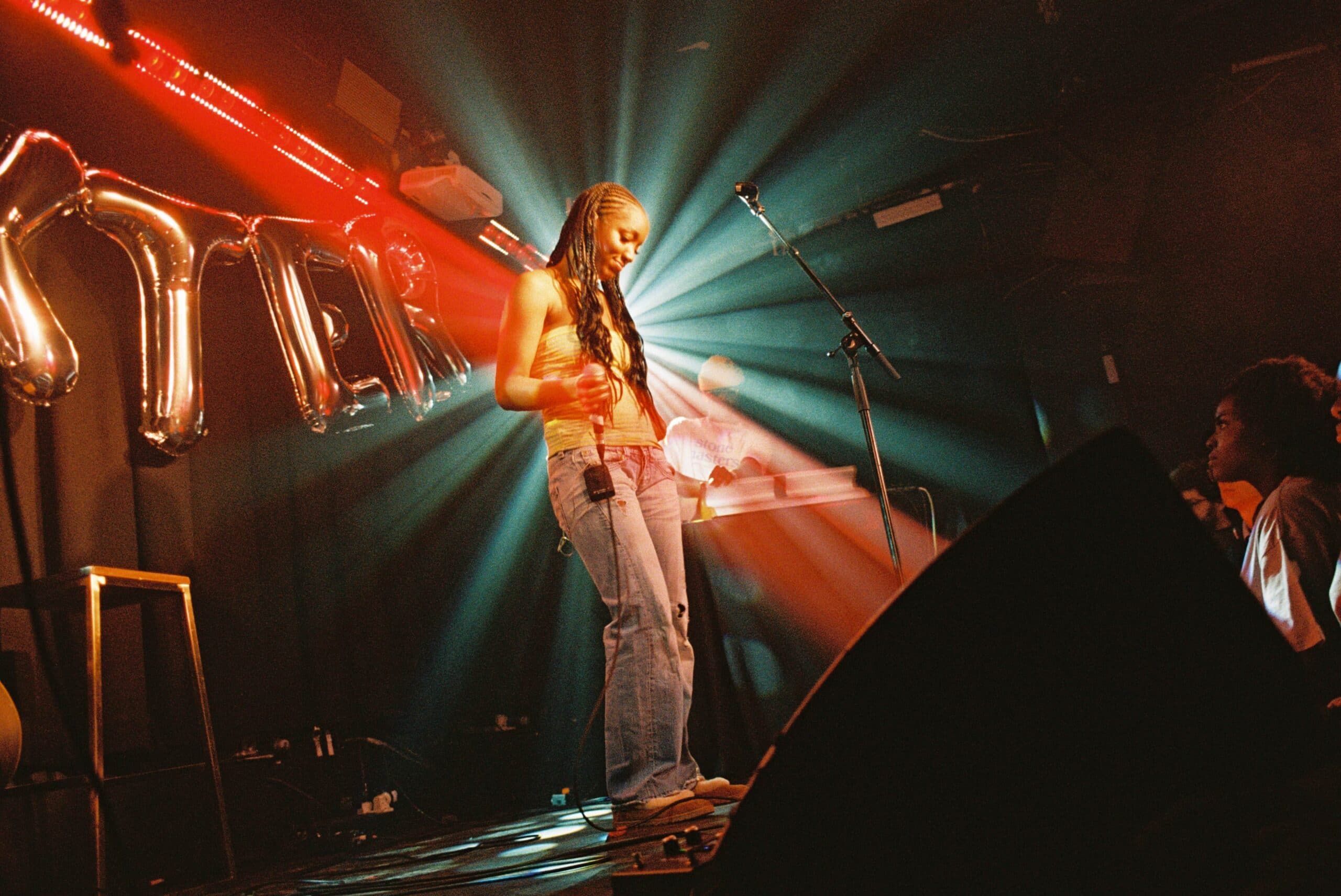 The stage looked like a sweet-16 fever dream, with floating letter balloons bobbing gently above her head and two mics set up side by side, teasing what was to come. Dexter, born Charmaine Ayokua, emerged in a fuzzy pink crown, green face gems catching the light. In an instant, the bedroom-pop theatrics that defined her early releases felt blown up to headline scale.