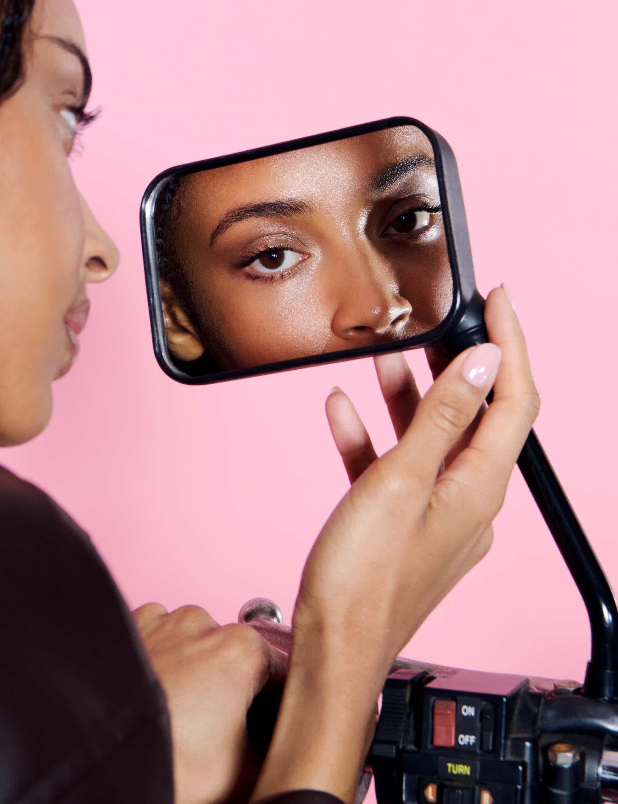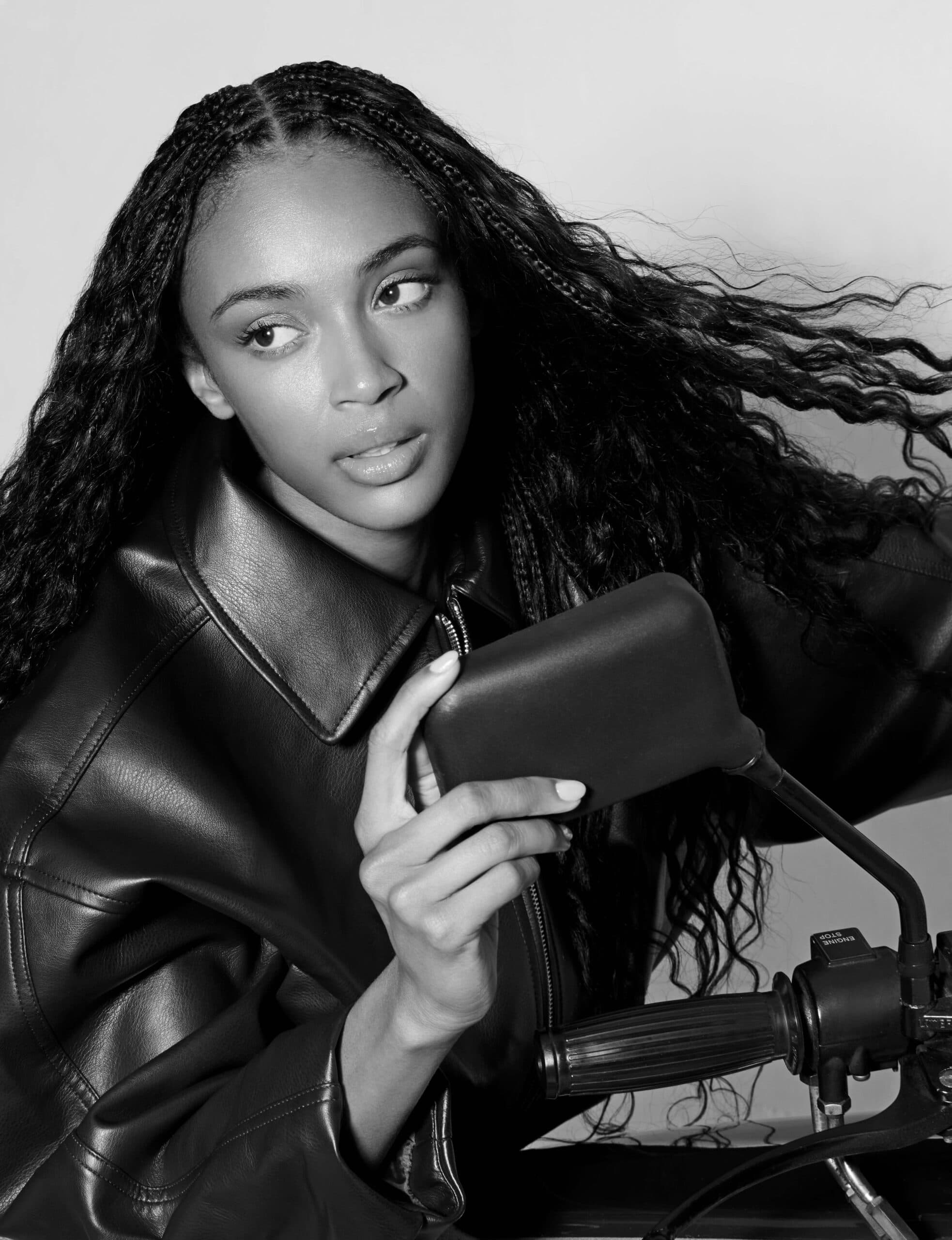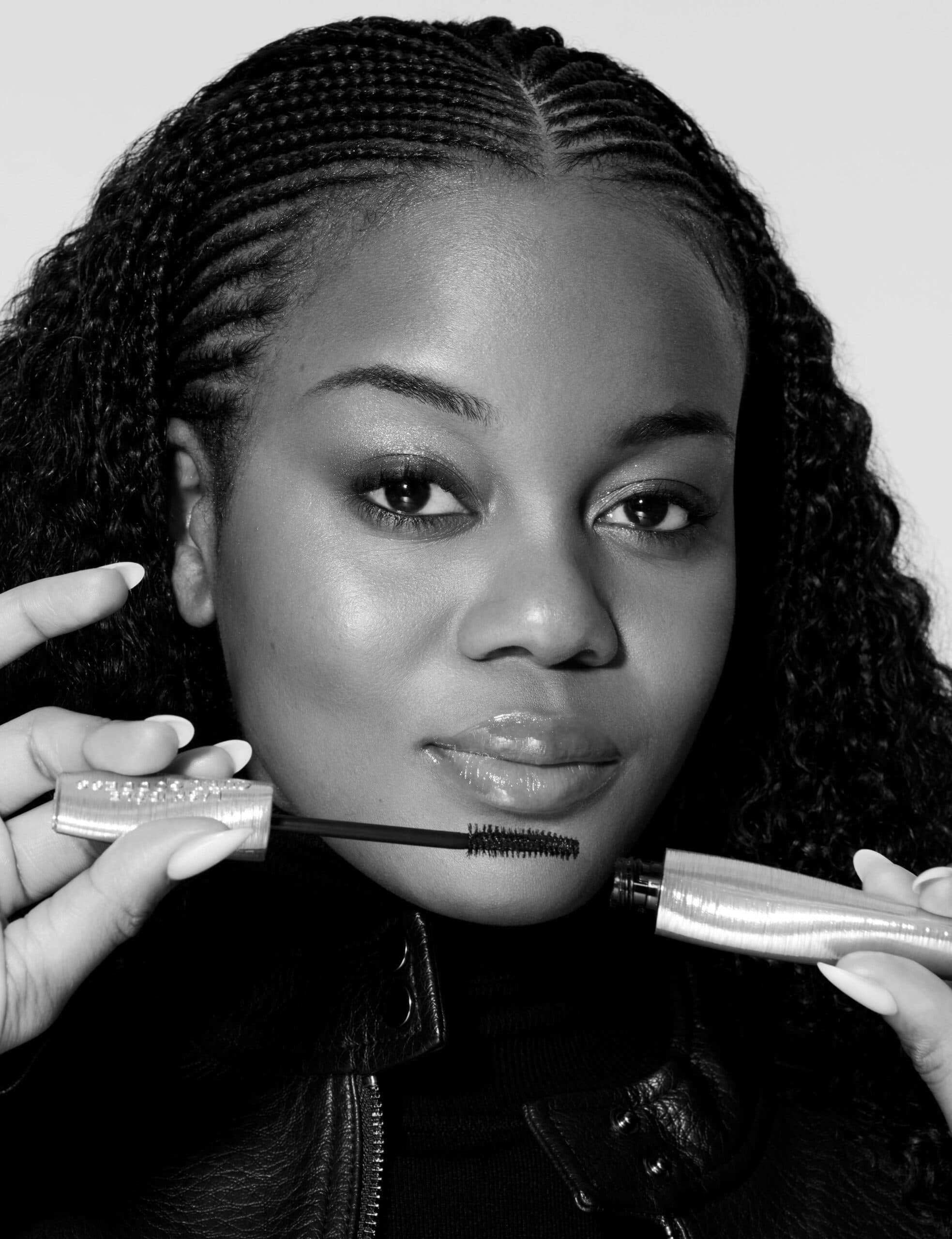 Tade wears LANCÔME Teint Idole Ultra Wear foundation in 410N on skin, LANCÔME Lash Idôle Curl Goddess mascara in Divine Black on lashes, LANCÔME Idôle Goddess Dimension Mono eyeshadow in 05 Meteor Smoke on eyes and LANCÔME Lip Idôle Juicytreat in 25 Toffee Talk on lips.