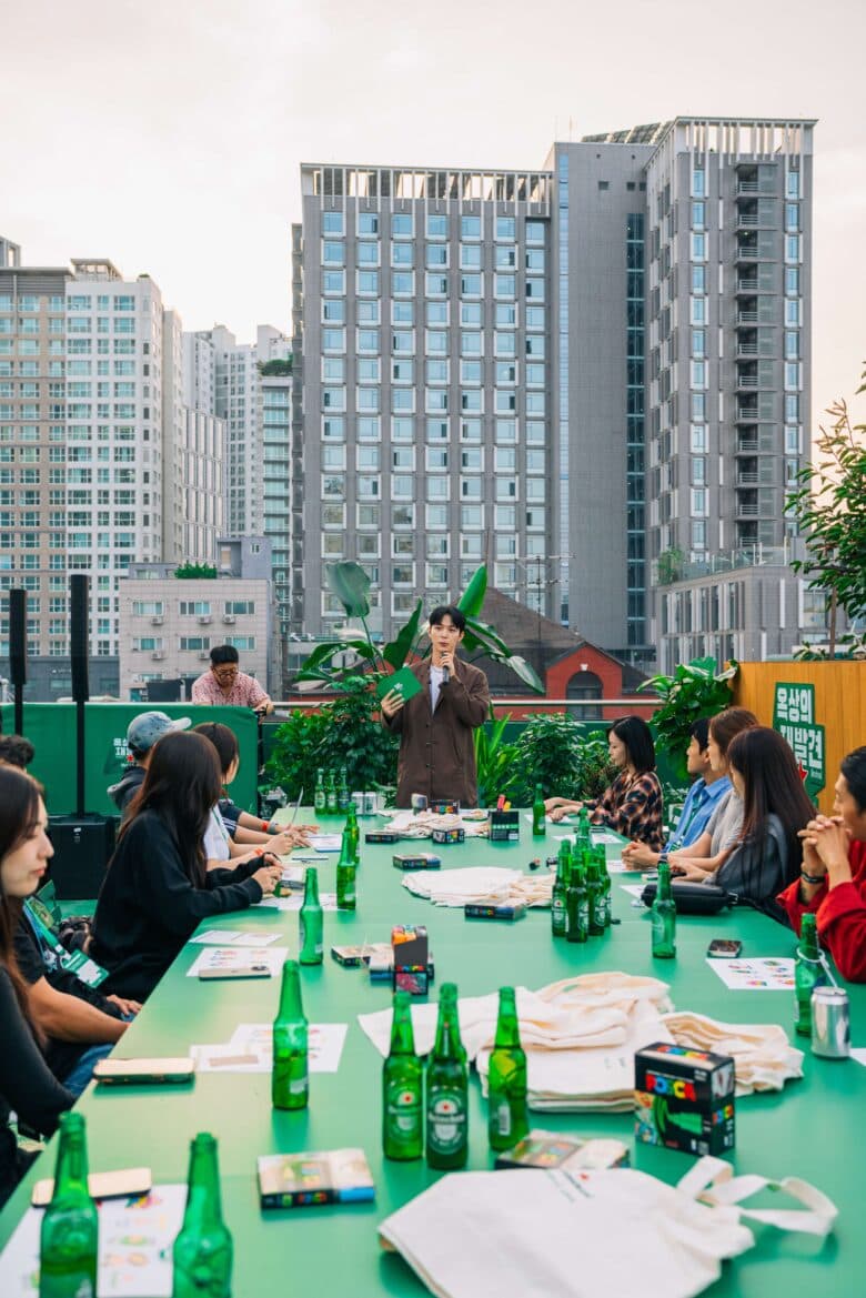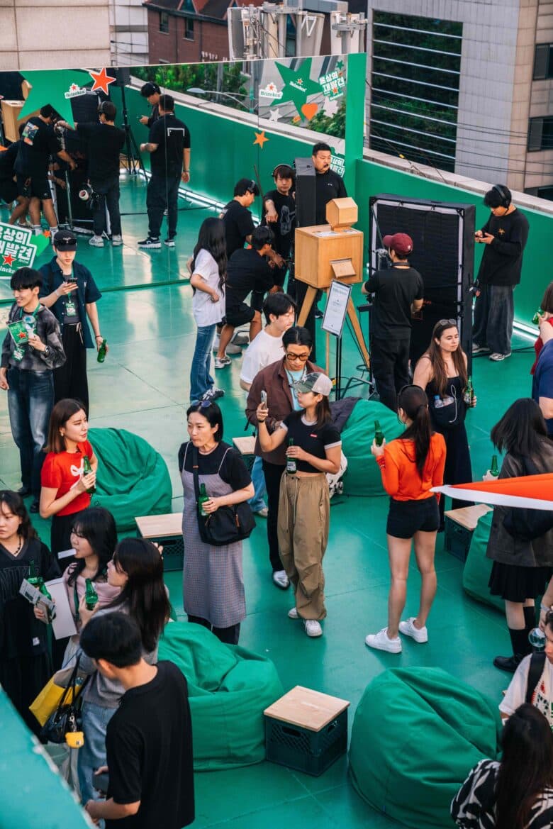 That’s where the rooftops come in. Seoul has one of the highest proportions of flat rooftop space in world cities, mostly completely unused and painted green. Heineken, a brand synonymous with this very colour, saw what city planners missed — a naturally blank canvas floating above the ghostly skyscrapers. Working with culture-makers like DINO from K-Pop group SEVENTEEN, contemporary artist Cha Inchul and chef Cho SeoHyeoung, they turned forgotten rooftops into social hubs. The locations of choice were punctuated by red stars using satellite imagery, signalling where these new hubs could be found.